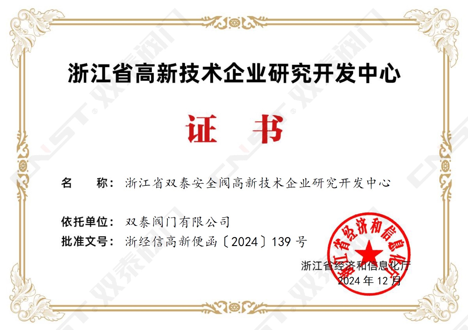 喜訊!雙泰閥門有限公司憑借在安全閥領(lǐng)域的技術(shù)創(chuàng)新和研發(fā)實力,成功榮獲“浙江省雙泰安全閥高新技術(shù)企業(yè)研究開發(fā)中心”稱號!這是對雙泰閥門多年來堅持科技創(chuàng)新、追求卓越品質(zhì)的充分肯定,也標志著公司在安全閥領(lǐng)域的技術(shù)研發(fā)實力邁上了新臺階。未來,雙泰閥門將繼續(xù)加大研發(fā)投入,致力于為客戶提供更安全、更可靠、更智能的閥門解決方案,為推動行業(yè)技術(shù)進步貢獻力量!