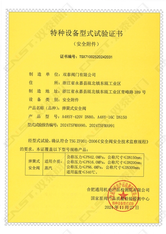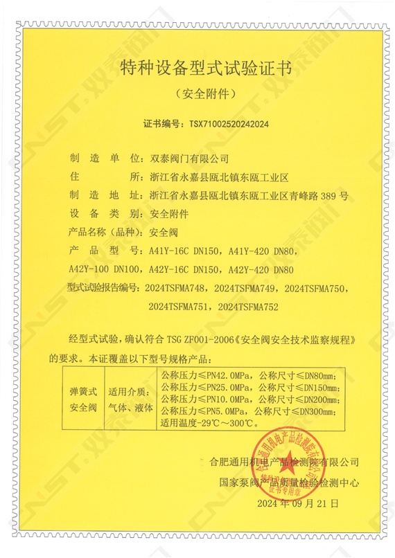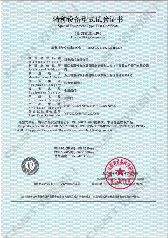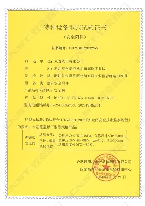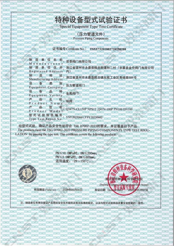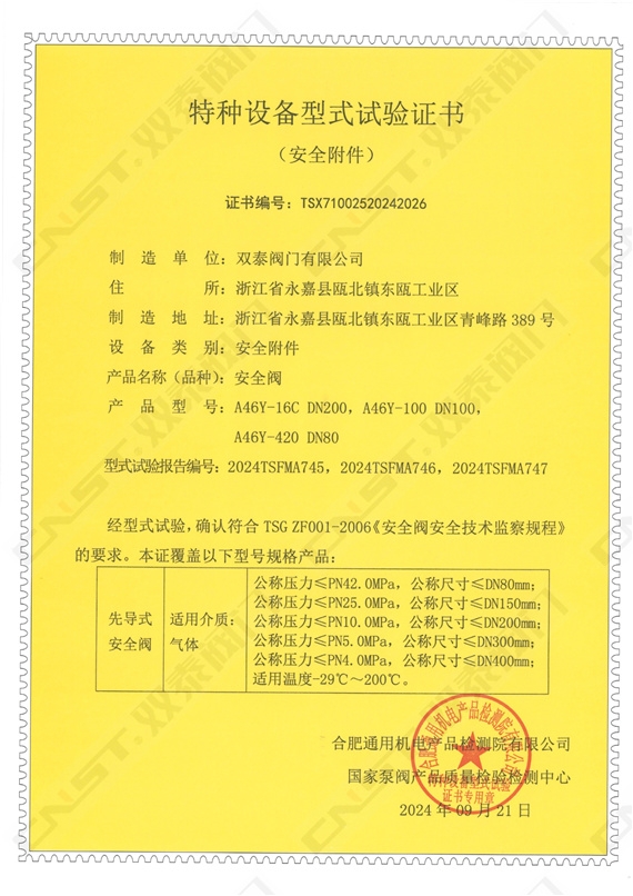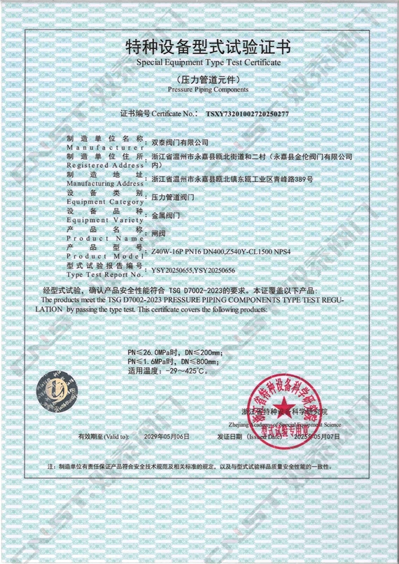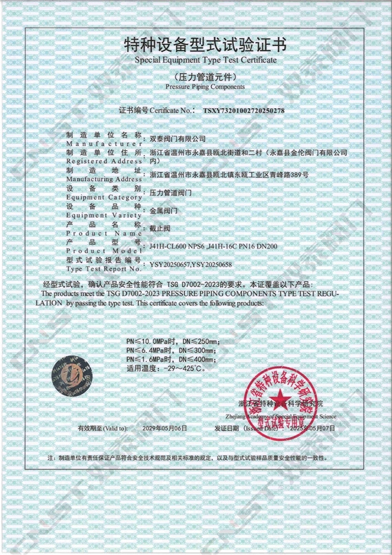 雙泰閥門(mén)自主研發(fā)生產(chǎn)的多種規(guī)格型號(hào)的蝶閥、球閥、閘閥、截止閥、止回閥等順利通過(guò)特種設(shè)備型式試驗(yàn),正式取得金屬閥門(mén)特種設(shè)備型式試驗(yàn)證書(shū)。標(biāo)志著雙泰閥門(mén)工廠秉承發(fā)展科技實(shí)力、嚴(yán)控產(chǎn)品質(zhì)量、產(chǎn)品創(chuàng)新的精神,一如既往地獲得國(guó)家相關(guān)專(zhuān)業(yè)機(jī)構(gòu)部門(mén)的認(rèn)可。